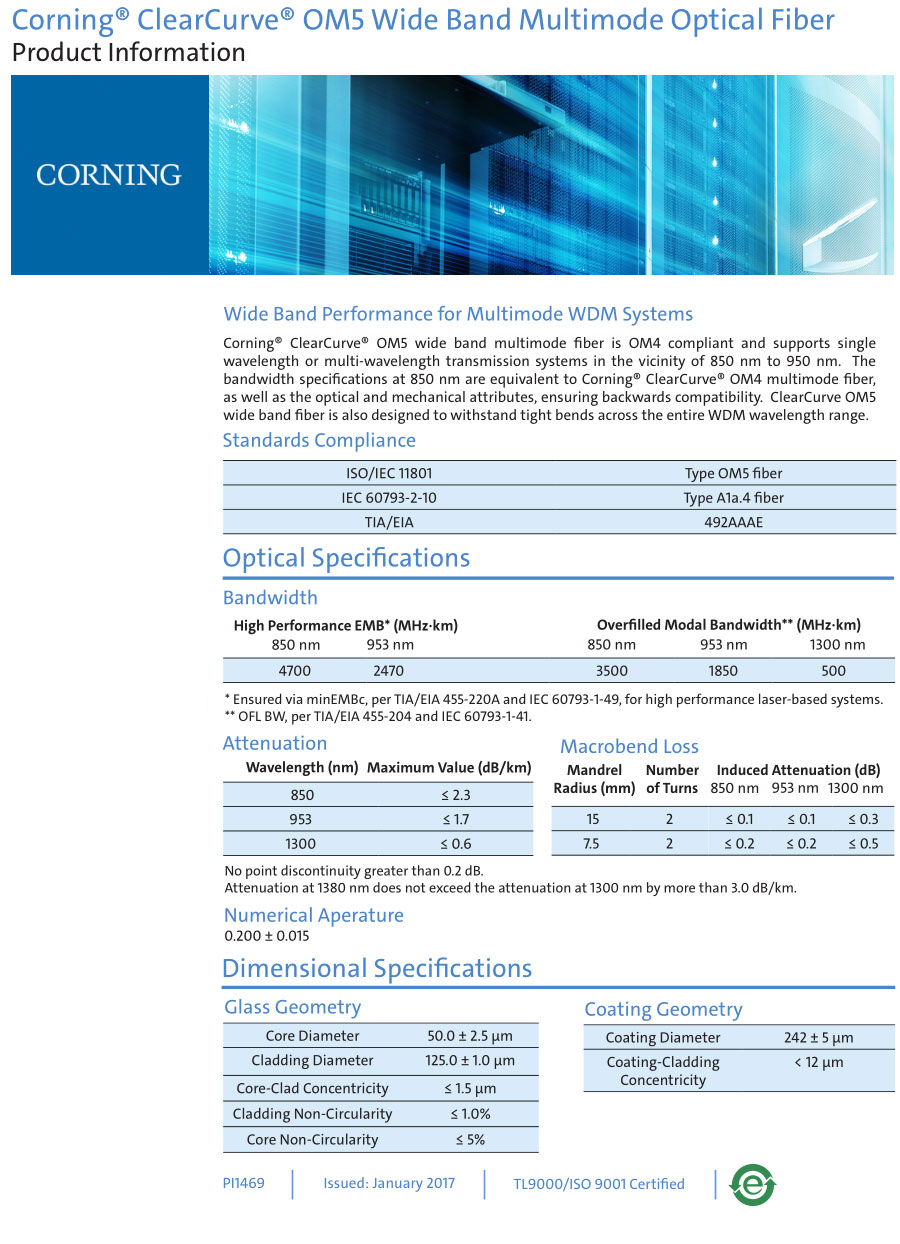 850nm的帶寬規(guī)格等同于ClearCurve?OM4多模光纖,以及光學(xué)和機(jī)械特性,可確保向后兼容。